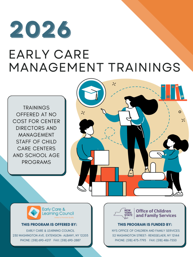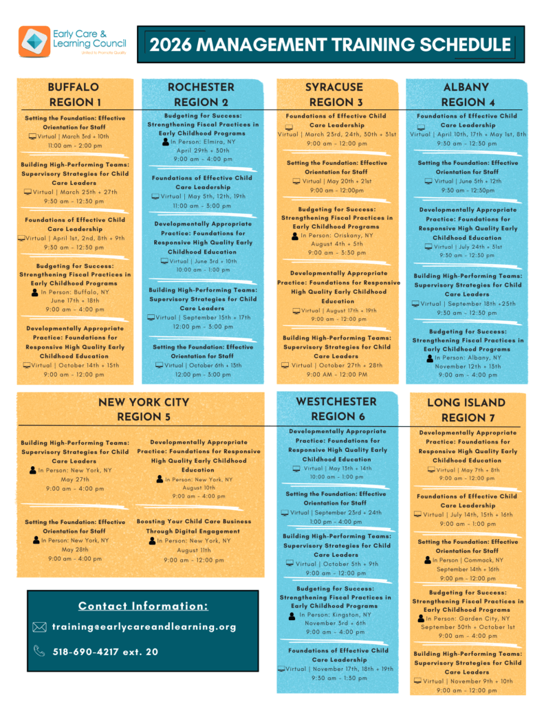 The Management Training Series equips directors with the skills and knowledge necessary to run high-quality, safe programs. With support from the Child Care Resource Center (CCRC), ECLC provides five core trainings funded by the New York State Office of Children and Family Services (OCFS) at no cost to participants.
